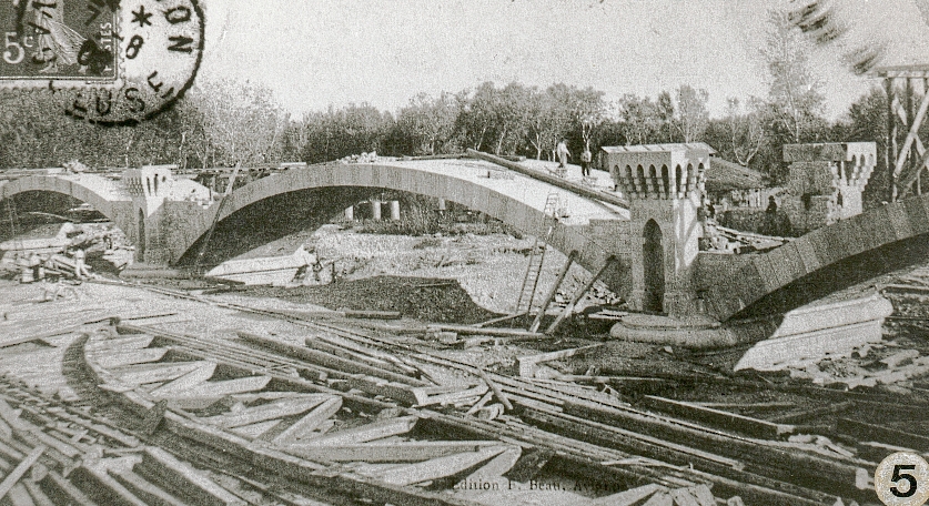 Ce pont, terminé en 1909, a été dynamité en 1972 et curieusement je n’en n’ai aucun souvenir alors que j’étais bien grandet…Il remplaçait le pont de bois construit début XXème et dont on aperçoit la base des piles restantes sous les arches, avec les anciennes «jambes de bois» coupées presque à ras. En amont on aperçoit le pont-passerelle construit pour permettre le passage le temps des travaux. Ce devait être un dimanche car aucun ouvrier ne s’affaire. La cheminée que l’on voit derrière est probablement celle de la chaudière qui faisait fonctionner, avant l’arrivée de l’électricité, la pompe d’alimentation en eau des réservoirs de la très fréquentée gare du Pont d’Avignon. Aujourd’hui, la cheminée a été démolie mais c’est toujours une histoire d’eau puisqu’une piscine l’a remplacée…