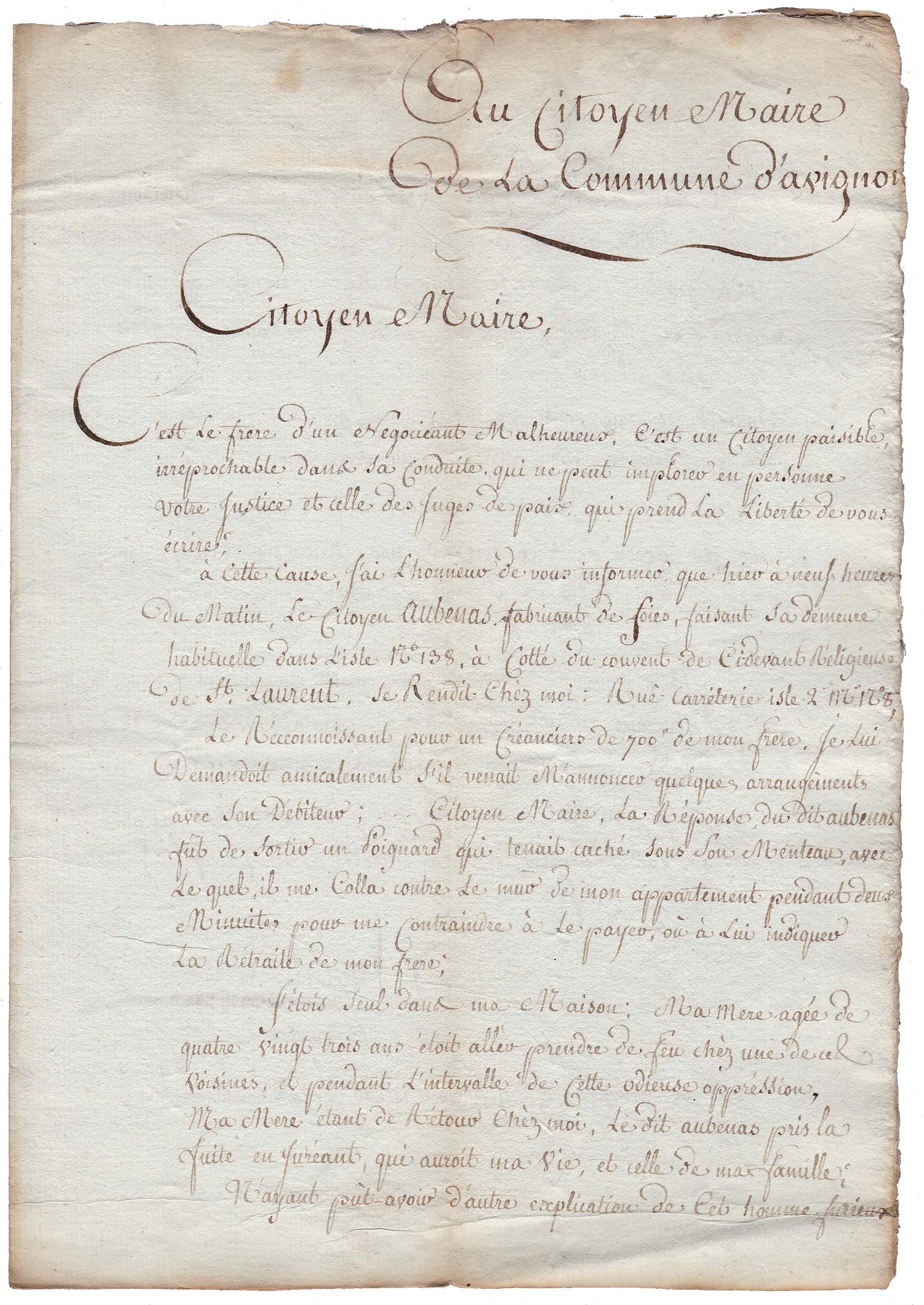 Le reconnaissant pour un créancier de 700⸄ de mon frère, je lui demandais amicalement s'il venait m'annoncer quelques arrangements avec son débiteur ; … Citoyen Maire, la réponse du dit Aubenas fut de sortir un poignard qui tenait caché sous son manteau, avec lequel il me colla contre le mur de mon appartement pendant deux minutes pour me contraindre à le payer, ou à lui indiquer la retraite de mon frère.