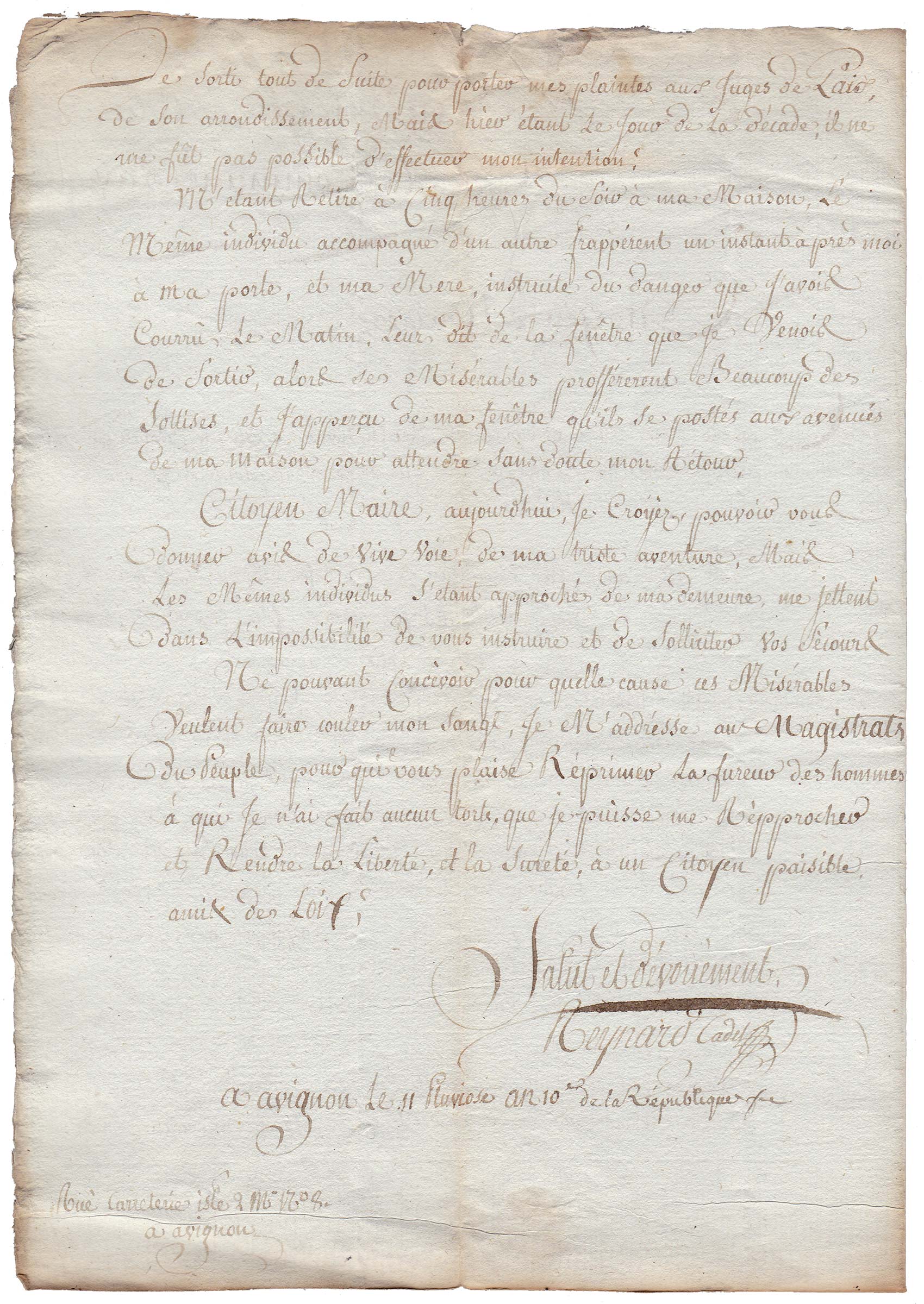 Citoyen Maire, aujourd'hui, je croyais pouvoir vous donner avis de vive voix de ma triste aventure, mais les mêmes individus s'étant approchés de ma demeure me jettent dans l'impossibilité de vous instruire et de solliciter vos secours.