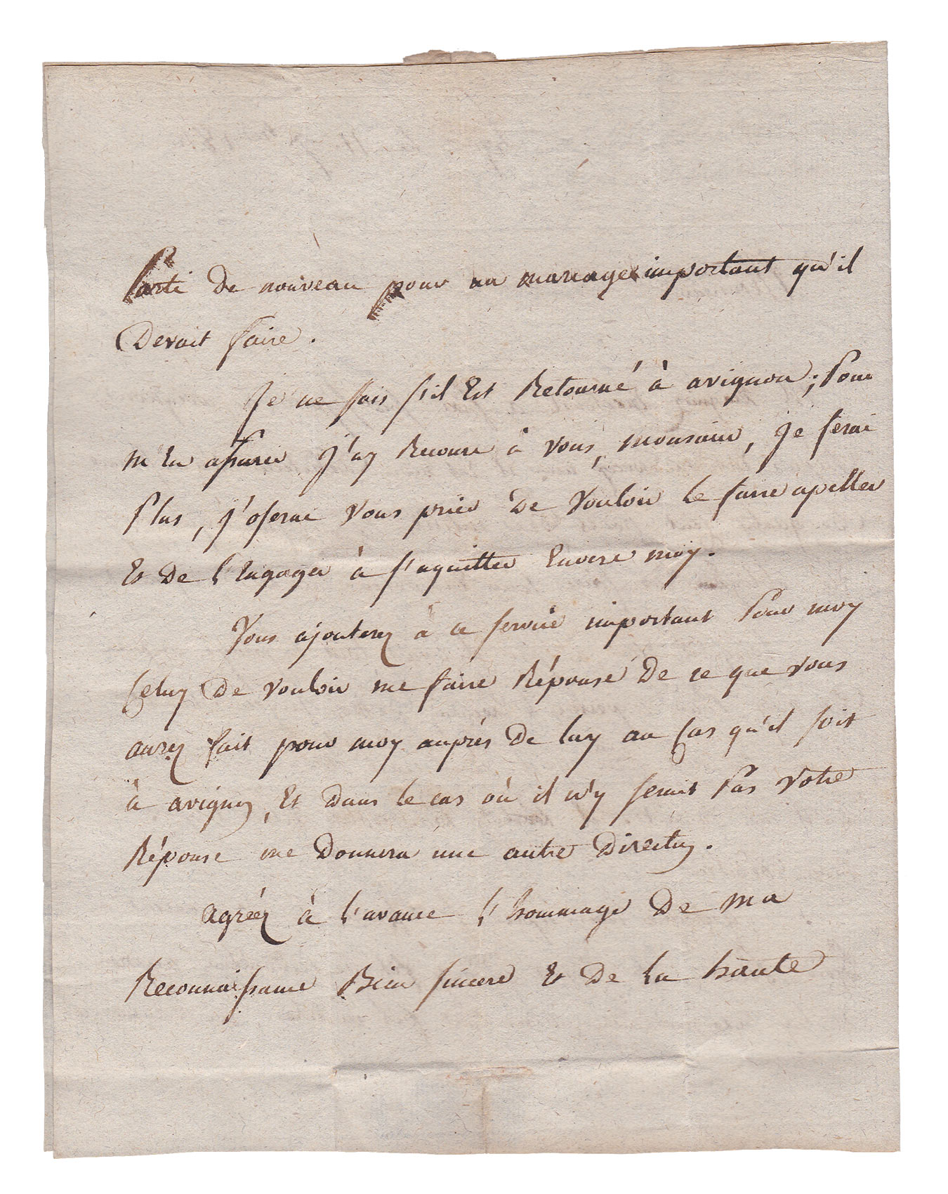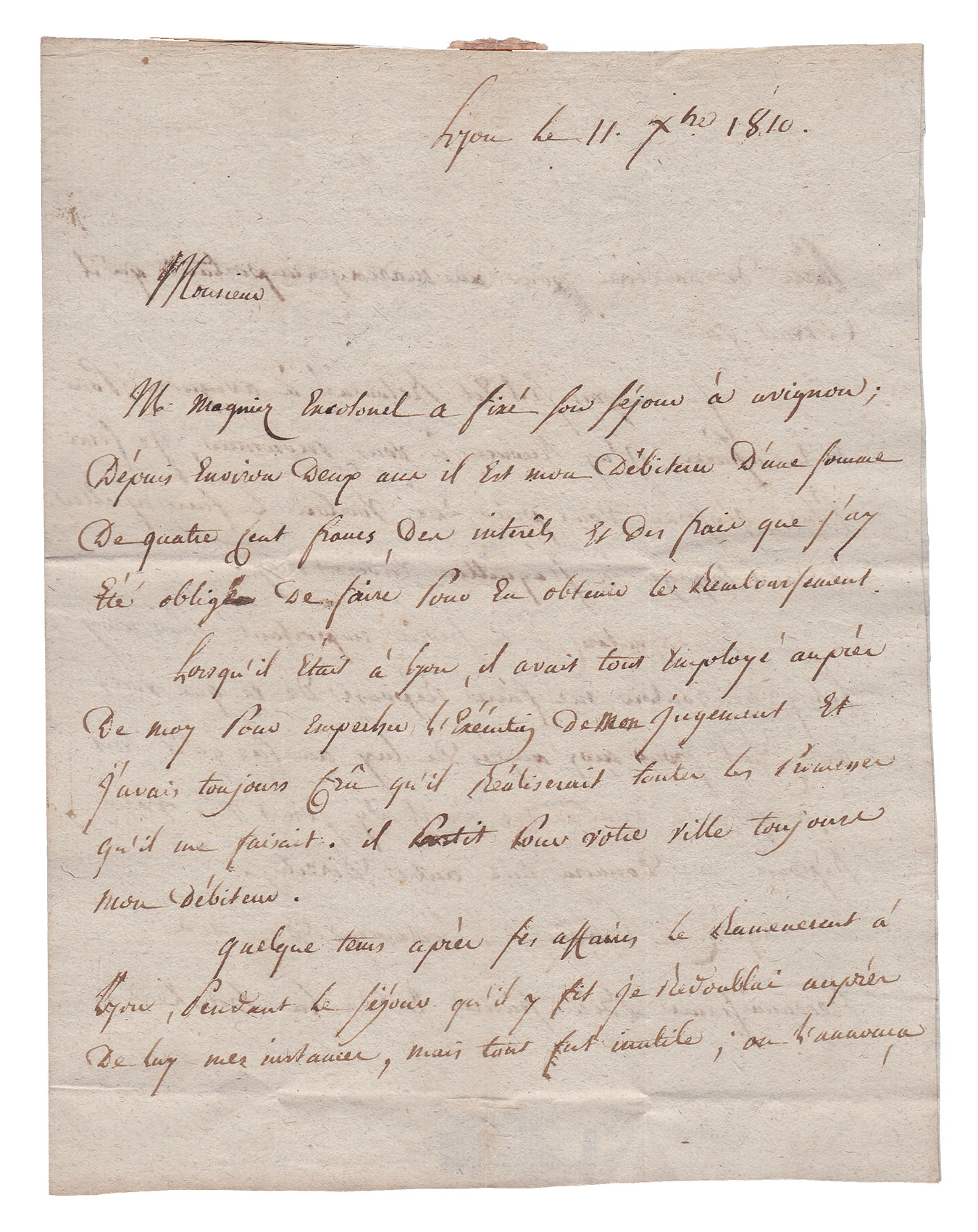 M. Magnier ex-colonel a fixé son séjour à Avignon ; depuis environ deux ans il est mon débiteur d'une somme de quatre cent francs, des intérêts et des frais que j'ai été obligé de faire pour en obtenir le remboursement. Lorsqu'il était à Lyon, il avait tout employé auprès de moi pour empêcher l'exécution de mon jugement et j'avais toujours cru qu'il réaliserait toutes les promesses qu'il me faisait. Il partit pour votre ville toujours mon débiteur. Quelques temps après les affaires le ramenèrent à Lyon. Pendant le séjour qu'il fit je redoublai auprès de lui mes instances, mais tout fut inutile ; on l'annonça parti de nouveau pour un mariage important qu'il devait faire. Je ne sais s'il est retourné à Avignon ; pour m'en assurer j'ai recours à vous, Monsieur, je ferai plus, j'oserai vous prier de vouloir le faire appeler et de l'engager à s'acquitter envers moi. Vous ajouterez à ce service important pour moi celui de vouloir me faire réponse de ce que vous aurez fait pour moi auprès de lui au cas qu'il soit à Avignon, et dans le cas où il n'y serait pas votre réponse me donnera une autre direction. Agréez à l'avance l'hommage de ma reconnaissance bien sincère et de la haute considération avec laquelle j'ai l'honneur d'être