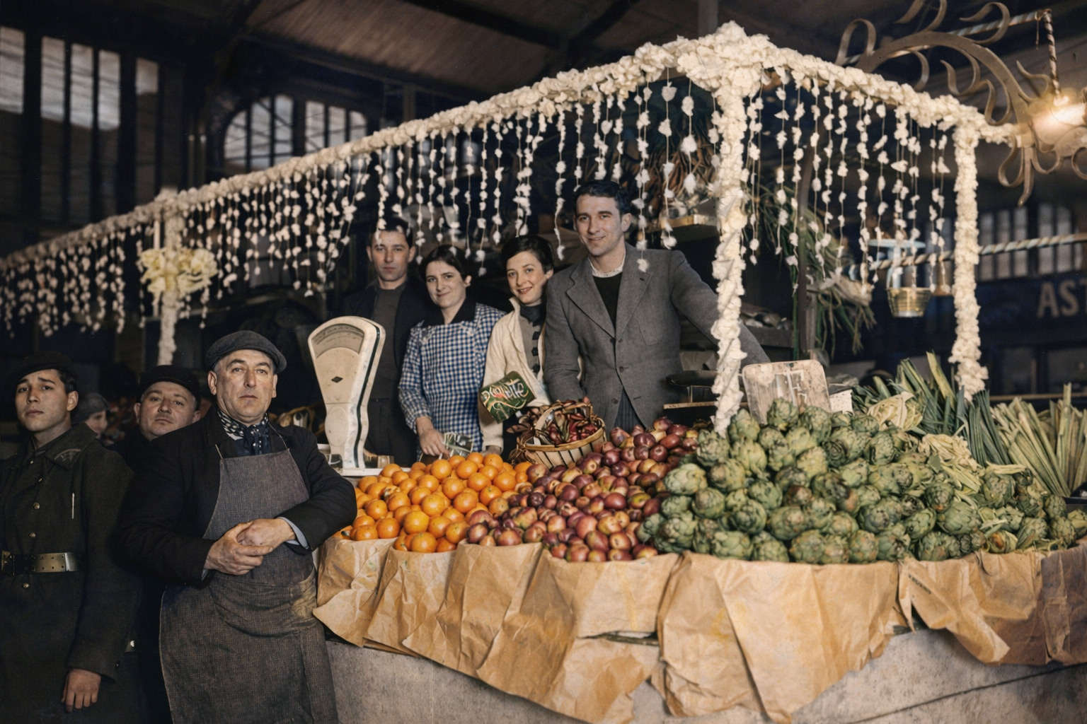 2026. 05. février Fru e liéume Fruits et légumesFruits and vegetablesObst und Gemüse Les Halles vers 1938. Photo anonyme colorisée par une IA. Lien permanent Tags : les halles, fruits et légumes, banc, commerce, soldat, décoration, anniversaire, cinquantenaire 0 commentaire Tweet