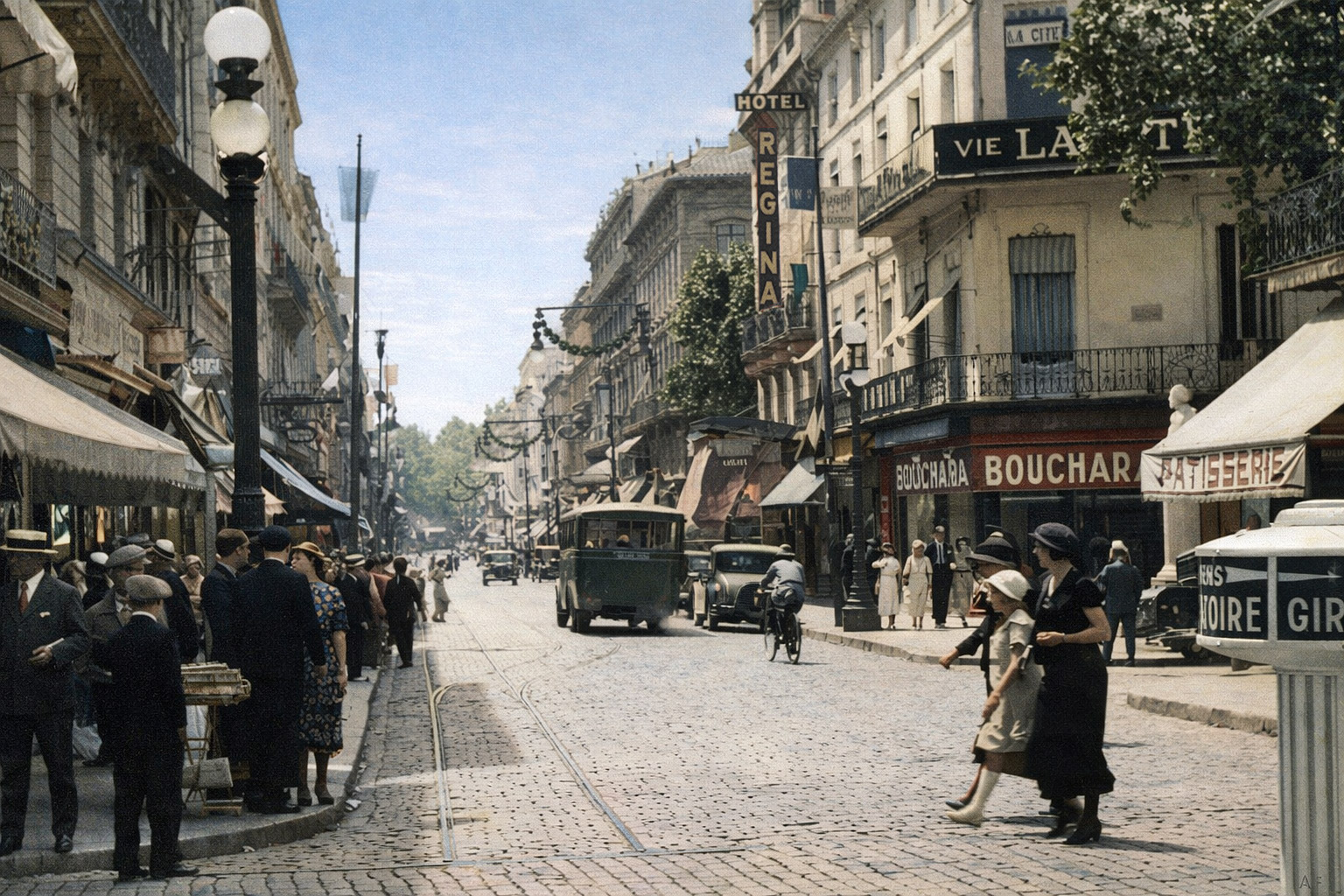 Rue de la République vers 1930. Photo A.F. colorisée par une IA.